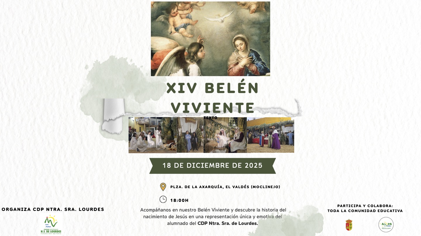 El Colegio Diocesano Nuestra Señora de Lourdes celebrará el próximo 18 de diciembre de 2025, a las 18:00 horas, su tradicional Belén viviente en la Plaza de la Axarquía, en El Valdés (Moclinejo). Será la decimocuarta edición de una cita muy especial para toda la comunidad educativa, que representará de forma sencilla y emotiva la historia del nacimiento de Jesús.