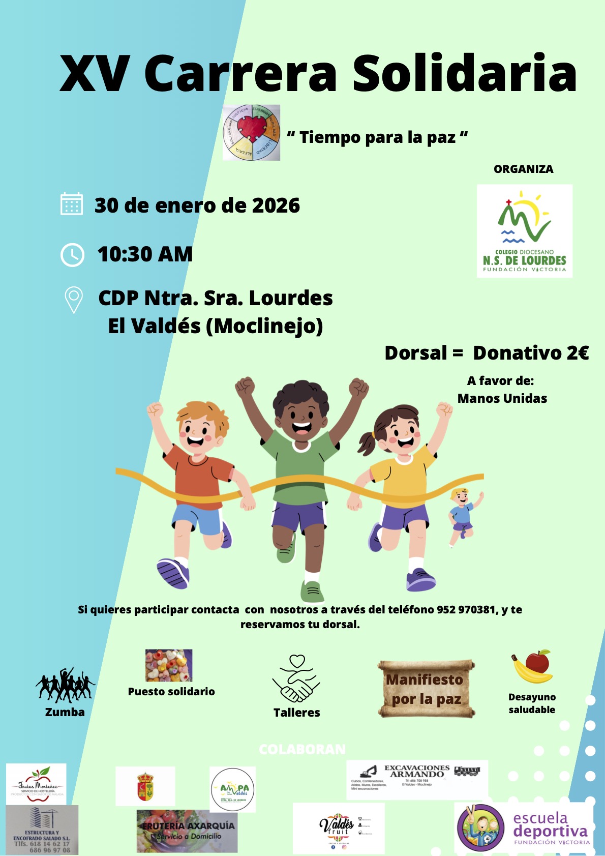 El Colegio Diocesano Nuestra Señora de Lourdes, centro perteneciente a Fundación Victoria, celebrará el 30 de enero de 2026, a las 10:30 horas, su XV Carrera Solidaria a favor de Manos Unidas. La cita tendrá lugar en el propio centro, en El Valdés (Moclinejo), y se enmarca en una propuesta educativa que une convivencia, compromiso social y educación en valores.